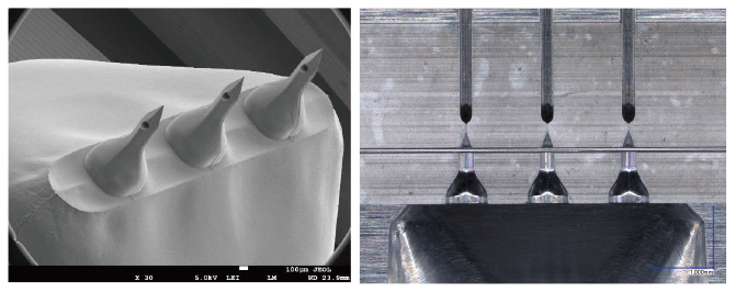 We create original injection molding methods that break away from conventional approaches, such as those used for transverse hole microneedles and ultra-thin microchannel devices. Furthermore, we pursue unique expertise in the technology for bonding molded components.