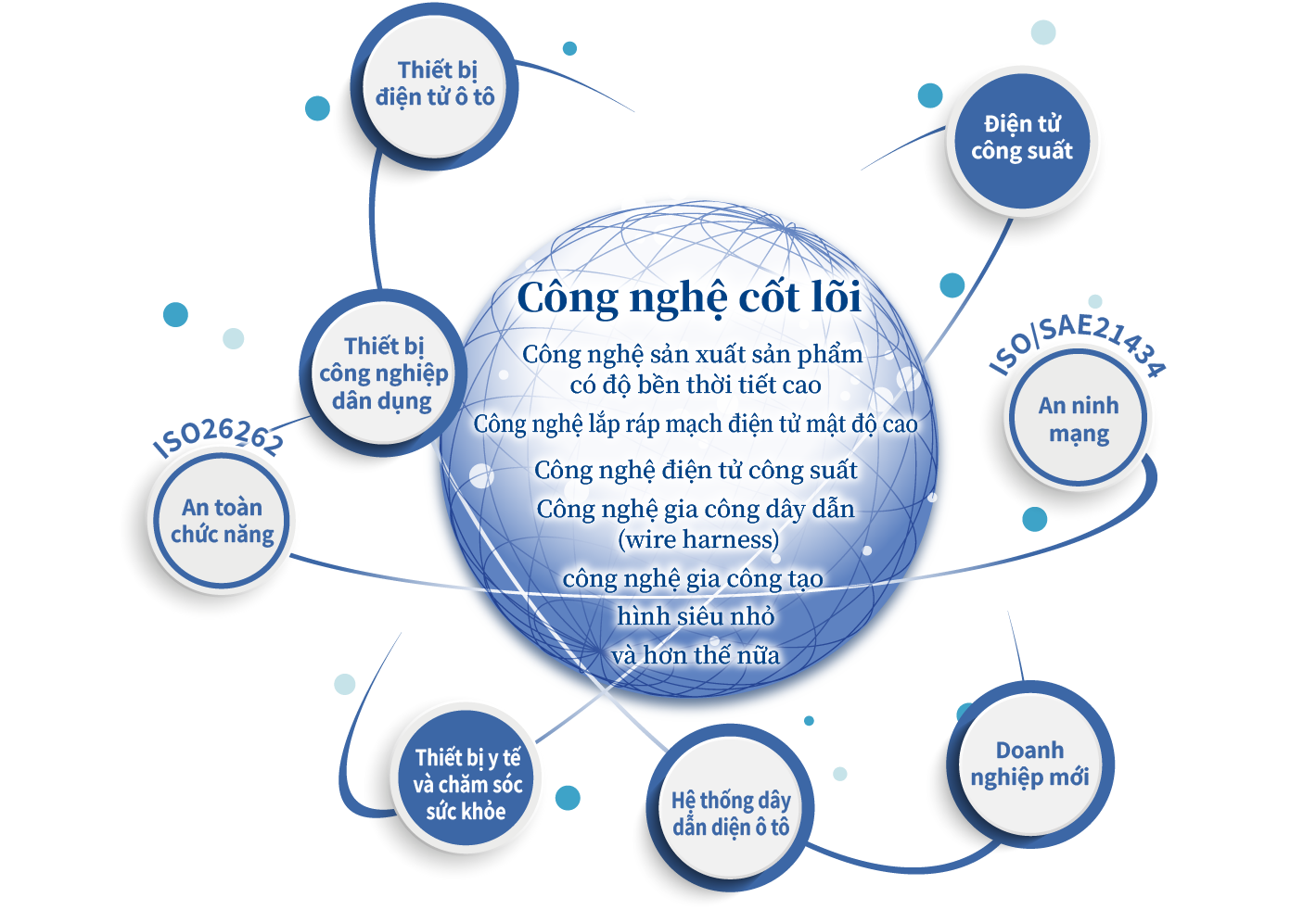 Bằng cách kết hợp những công nghệ này, hoạt động kinh doanh được mở rộng trên nhiều lĩnh vực đa dạng, bao gồm "Thiết bị điện - điện tử trên xe", "Thiết bị Công nghiệp và Dân dụng" và "Hệ Thống Dây Dẫn Điện (Wire Harness)".